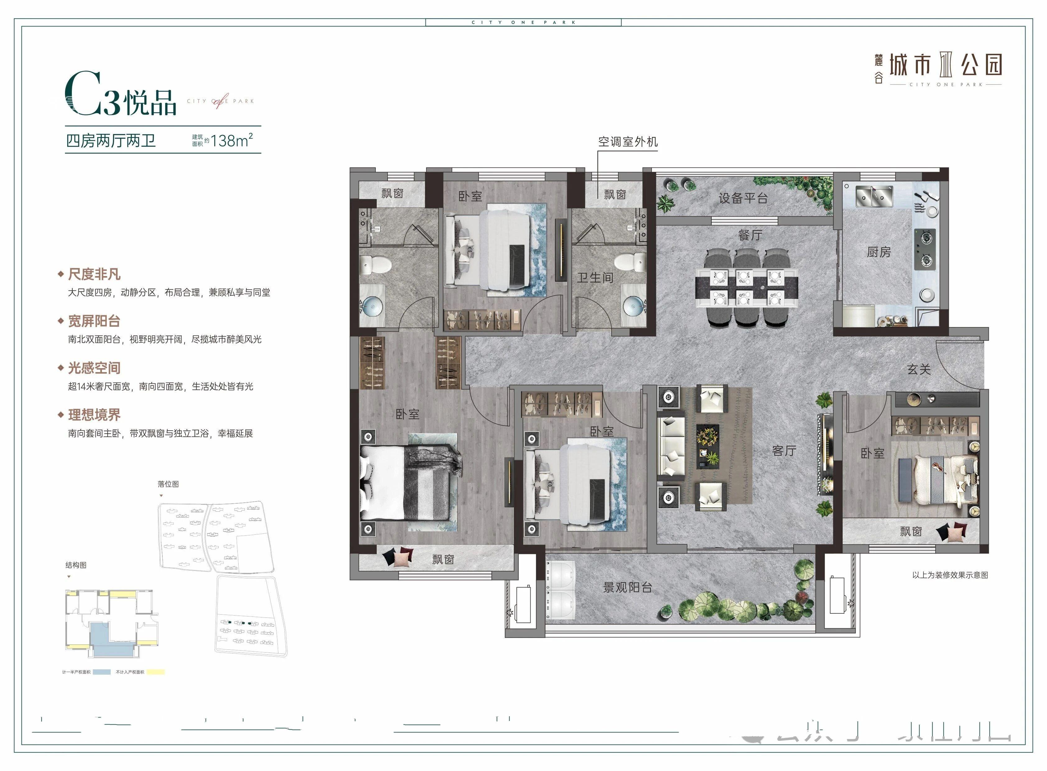 • C3悦品:4室2厅2卫1厨       面积:约138㎡