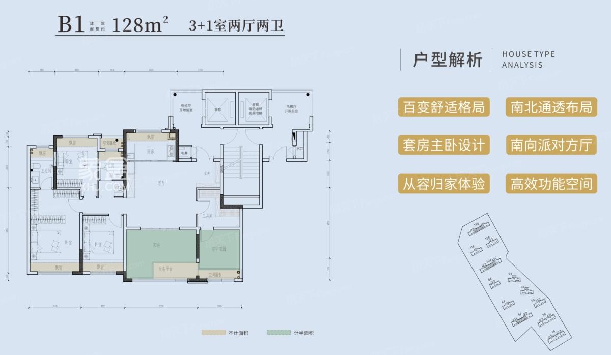 • B1户型:3室2厅2卫1厨       面积:约128㎡