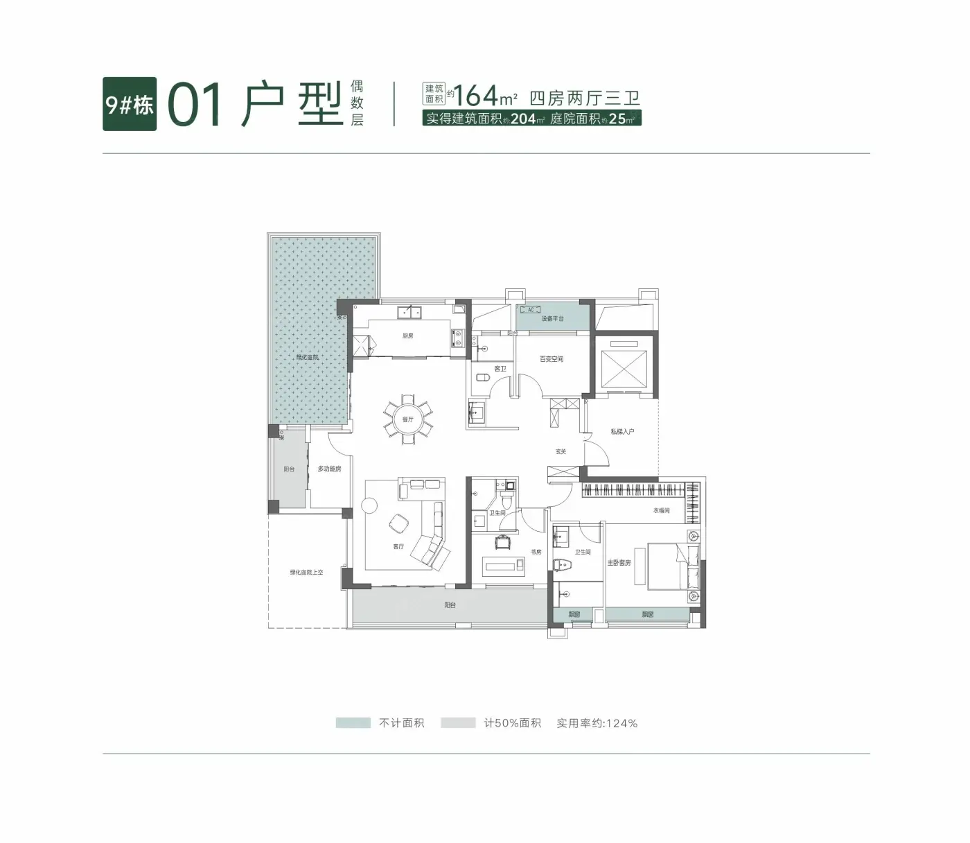 • 9#01偶数层164㎡:4室2厅3卫1厨       面积:约164㎡